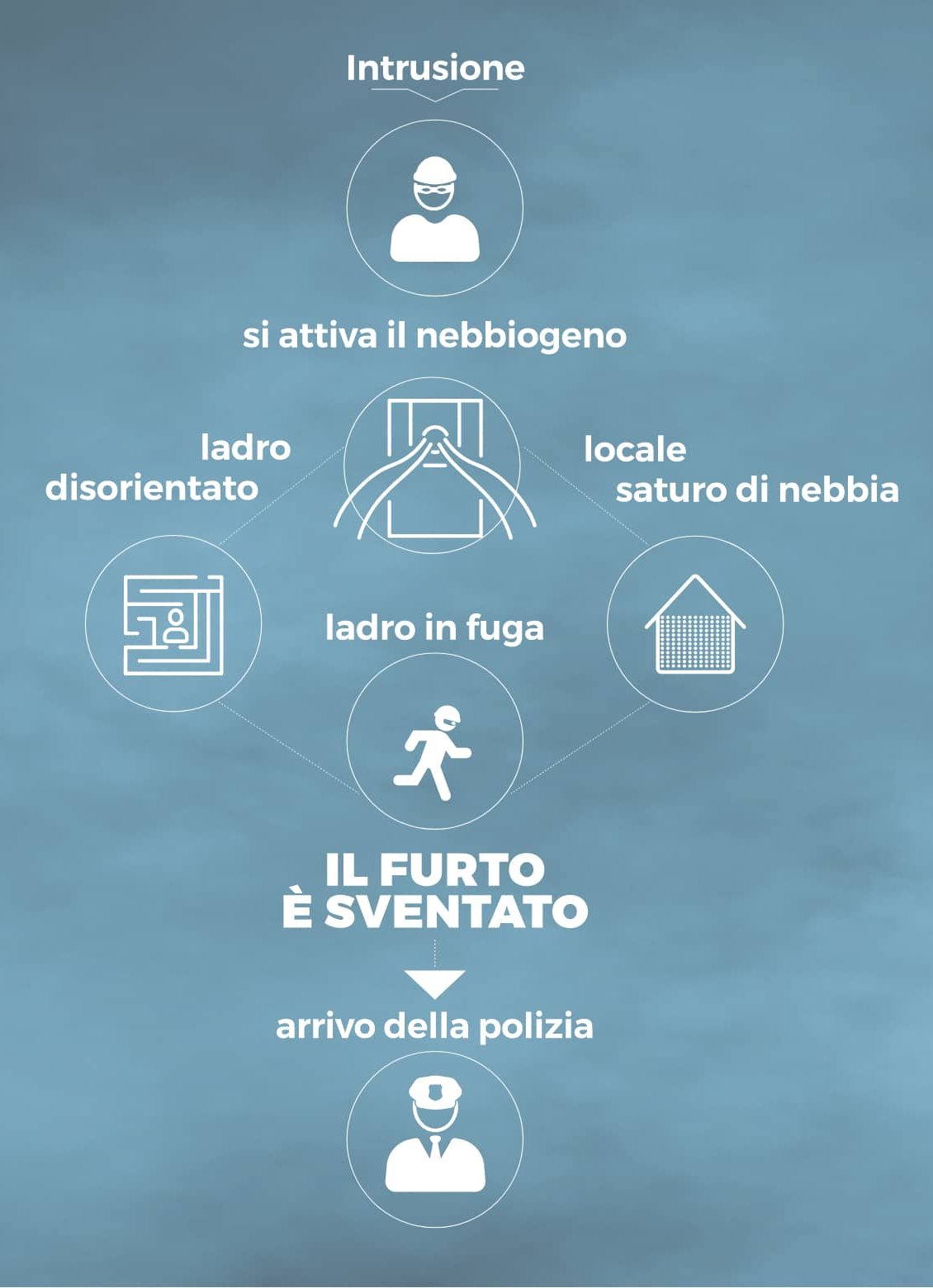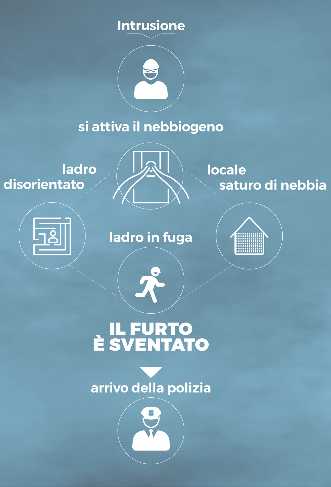 Una nebbia naturale, atossica e non infiammabile, nasconde i tuoi beni agli occhi dei ladri proteggendoli da furti e danneggiamenti.